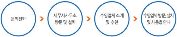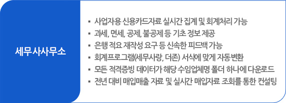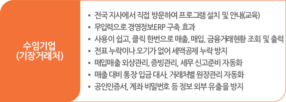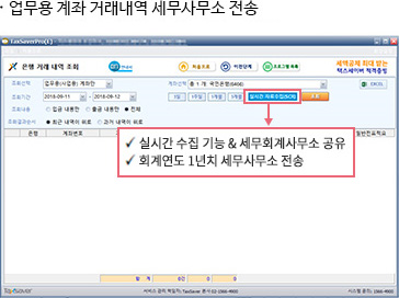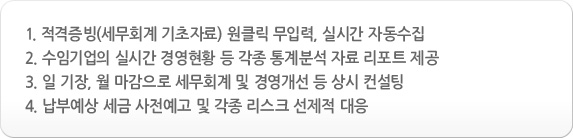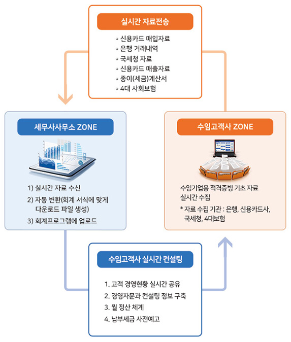 세무회계사무소와 수임업체에서 프로그램을 각각 설치하면, 수임업체에 설치된 프로그램에서 해당 사업자의 세무회계 기초자료(은행, 신용카드, 국세청 등)를 실시간으로 수집하여 사장님께는 경영정보를 제공하고, 세무회계사무소에는 자동으로 해당 데이터를 전송해주는 프로그램입니다.